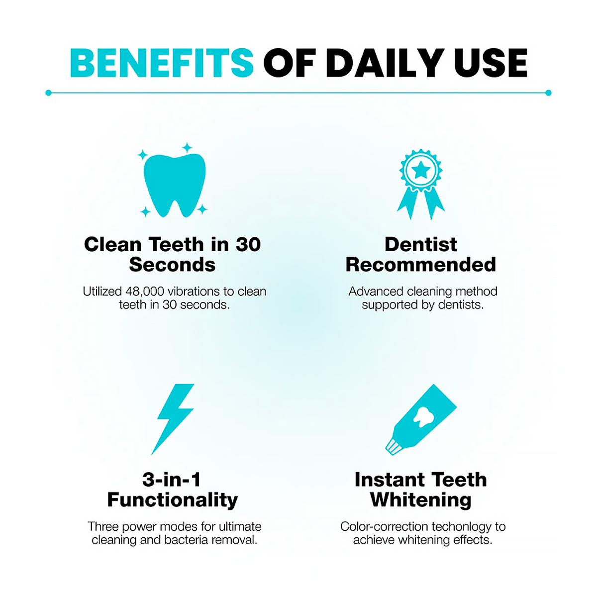 The world's first fully automatic toothbrush that cleans your teeth in just30 seconds! Each tooth experiences 48,000 vibrations per minute, providing thorough cleaning and a sensation that our customers describe as a dental massage...but it's so much more than that!